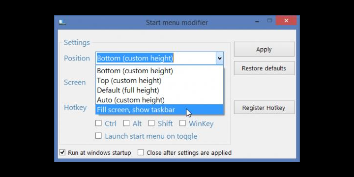 - En el menú Position, elegimos la opción Fill screen, show taskbar.