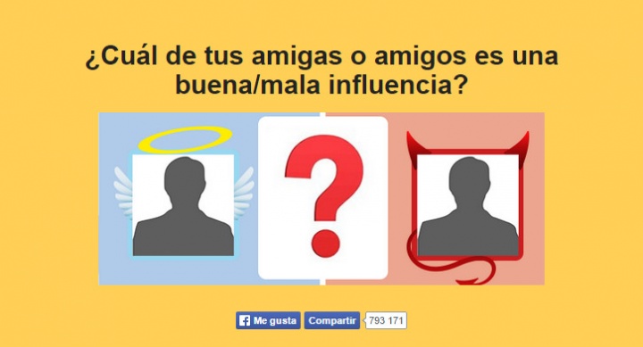 Lo cierto es que los test de Facebook son todo un clásico de la red social. Algunos se se acordarán de Alegra.me, un servicio muy popular a finales del año pasado, y los demás seguro que conocen eWikin, responsable del viral del origen oculto de tu nombre. Pues bien, ahora es el turno de "¿Cuál de tus amigas o amigos es una buena/mala influencia?", la nueva app viral de Facebook que está causando furor.
