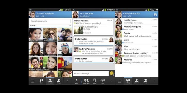 BBM para Android permite chatear con todos los usuarios de la app ya sean de Android o BlackBerry. Incluso podemos crear grupos de hasta 30 miembros, enviar mensajes de difusión como en WhatsApp, enviar emoticonos, et.c