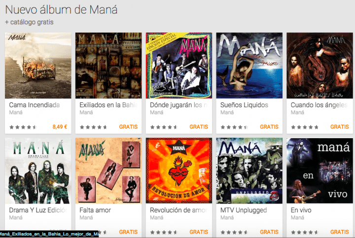 Si entramos en Google Play y filtramos por Maná, veremos todos sus álbumes. Tenemos 12 álbumes que podemos descargar, 11 gratis y 1 de pago, que es el último que han sacado. Este último es "Cama incendiada" y tiene un coste de 8,49 euros para su versión digital, que no está nada mal tampoco.
