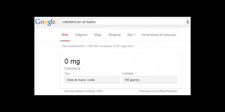 Aparte de esa información detallada, podemos ver la descripción del alimento. Para acceder a esas fichas tan solo debemos hacer preguntas simples en el buscador que pueden ser “azúcar del tomate”, “colesterol del huevo”, “proteínas de la carne”, etc.