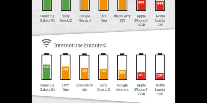 Which.co.uk ha publicado una infografía en la que vemos los smartphones del momento y su autonomía. Así vemos cuánto dura la batería del móvil según el uso. Clasifica el uso en llamadas, el uso tradicional del móvil, y conectado a Internet, ya sea navegando o con hablando por WhatsApp, por ejemplo.