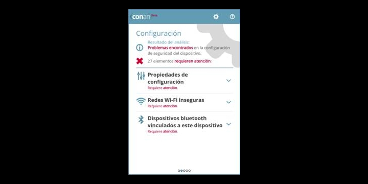 CONAN Mobile funciona de forma proactiva para proteger el terminal Android en todo momento. Incluso es capaz de conocer si el dispositivo está rooteado, con el modo debug ADB activo, el Bluetooth, la instalación de apps desde orígenes desconocidos habilitada o la ausencia de pantalla de bloqueo. Nos alertará en caso de qué algún mecanismo de seguridad importante no esté activo.