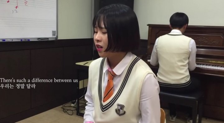 La joven canta realmente bien, eso es innegable. Vemos que se encuentran en una aula de música, en la que podemos ver algún equipo de sonido como un altavoz y una pizarra con notas sobre ellas.
