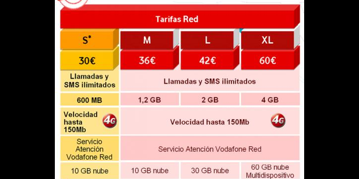 - Vodafone RED XL con 4Gb de navegación, llamadas y mensajes ilimitados. Su precio asciende a los 60 euros mensuales.