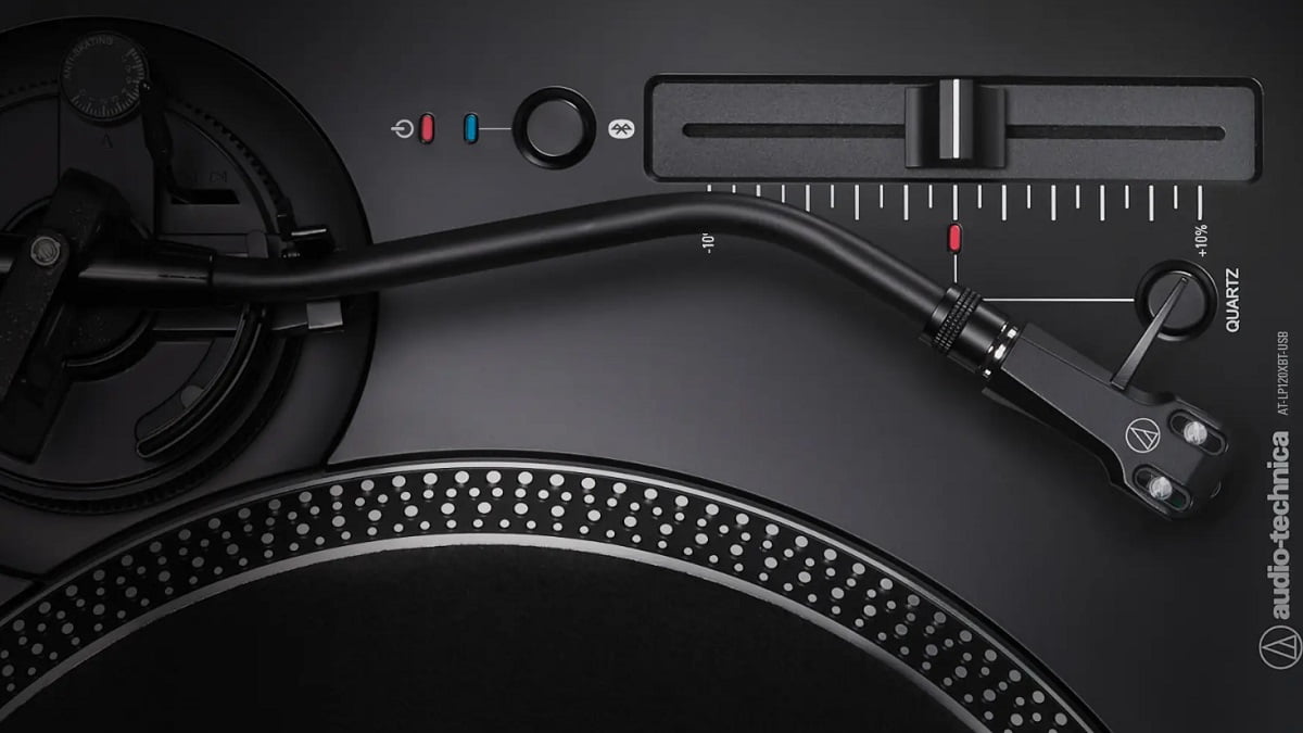 Justo en la parte lateral derecha, al lado del brazo, el Audio-Technica AT-LP120XBT-USB cuenta con un cómodo control deslizante para ajustar el tono (velocidad) hasta un máximo del 10 % o disminuirlo en hasta un 10 %. Además, en esta sección tenemos el botón “QUARTZ” para bloquear la velocidad estándar con una exactitud impecable.