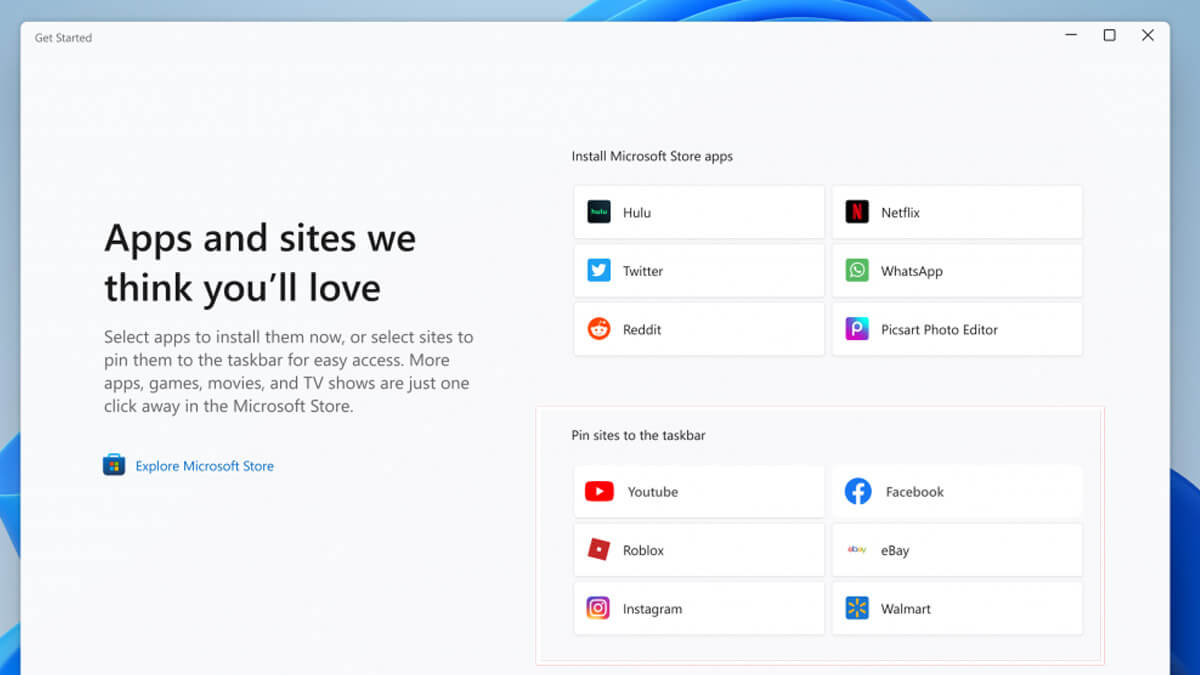 También, han agregado sugerencias de sitios anclados a la aplicación “Comenzar” para que puedas anclar sitios web cómodamente a tu barra de tareas. Para encontrar esta nueva función, inicia la aplicación “Comenzar” y dirígete a la página "Aplicaciones y sitios que creemos que le encantarán".