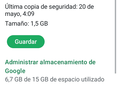 - Ahí podremos ver que, en nuestro caso, la copia de WhatsApp ocupa 1,5 GB y que tenemos ocupado 6,7 GB de 15 GB en Google Drive, así que todavía nos queda bastante espacio libre para las copias de WhatsApp, concretamente algo más de 8 GB.